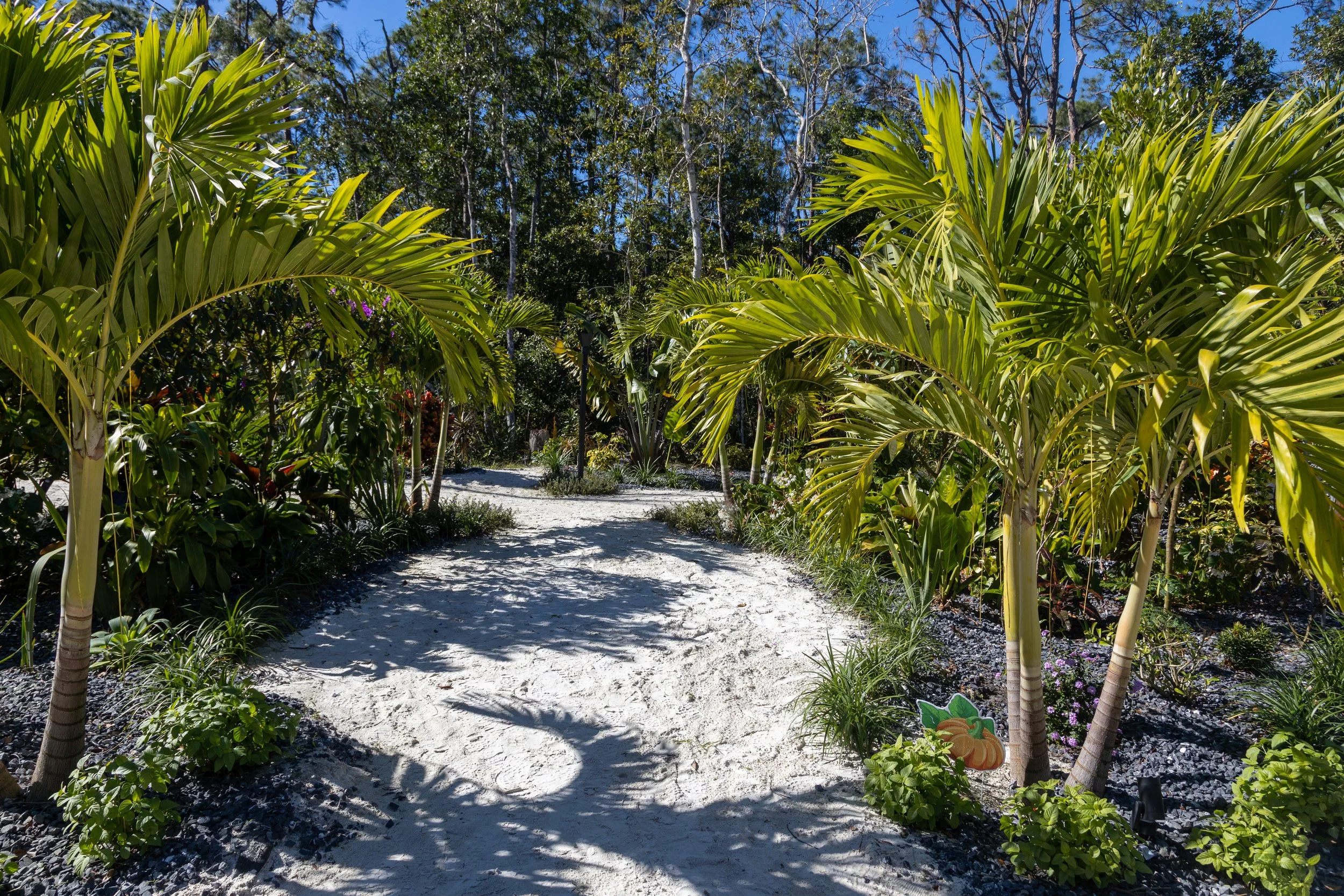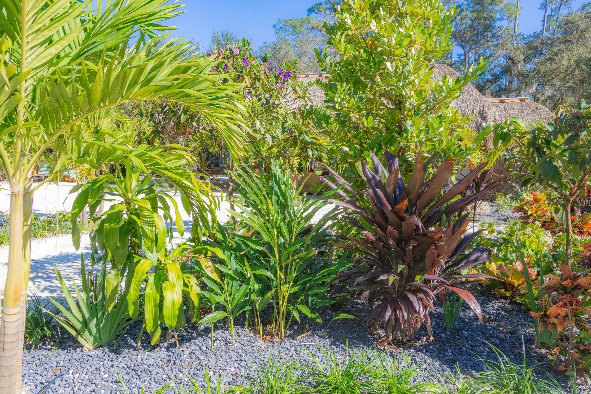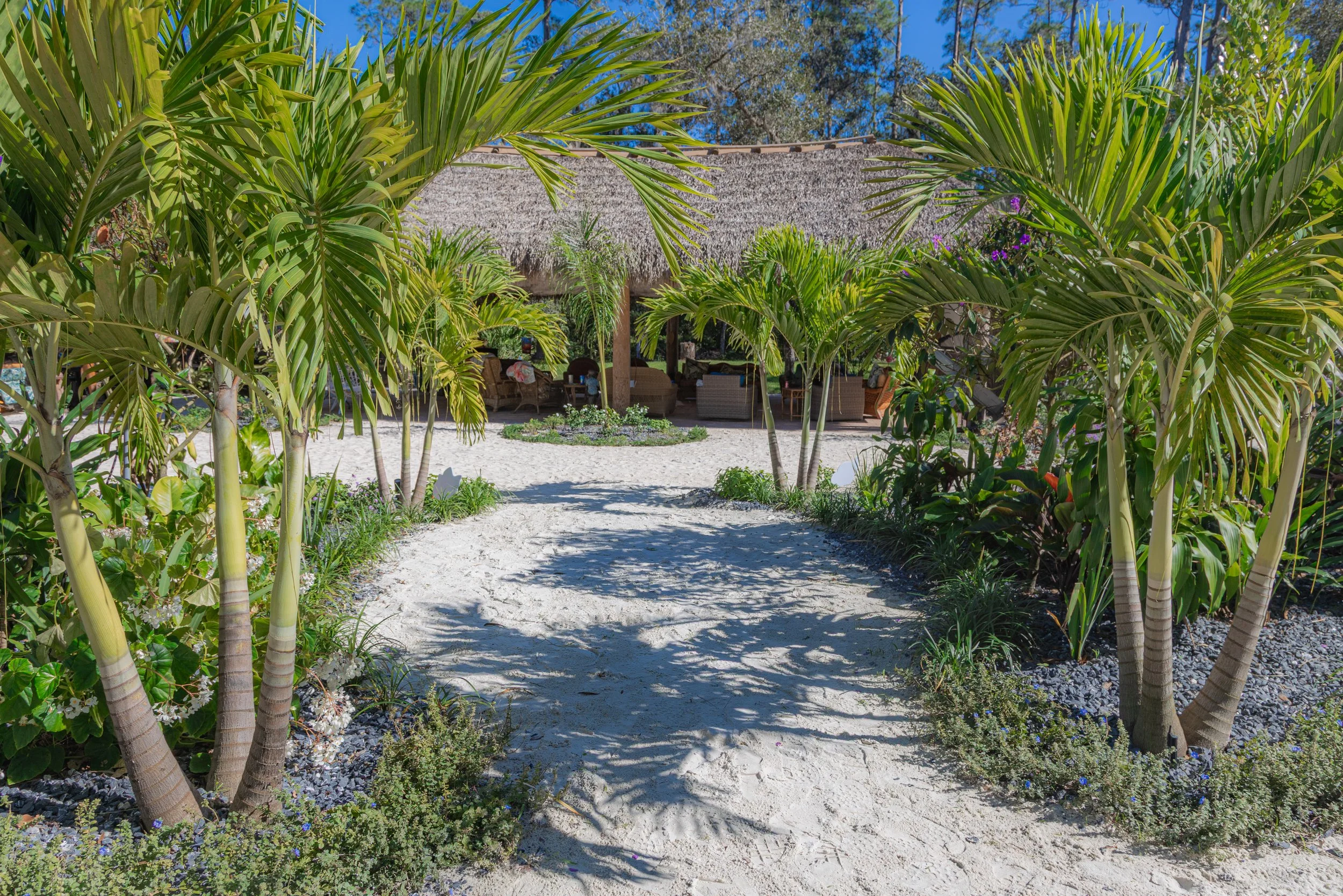 Barefoot paths, tropical textures, and a handmade tiki at the heart of it all.
